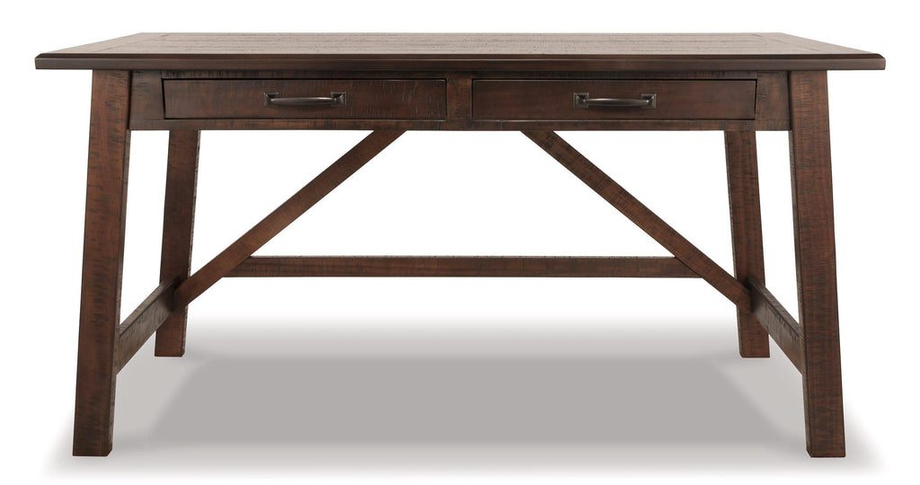 Leaning toward a casually cool look with a touch of rustic industrial flair? This home office desk with canted legs takes a fresh stance on style. Two smooth-gliding drawers with dovetail construction reflect high quality that never goes out of fashion. Saw marks infuse a touch of rich distressing. Antiqued sculptural pulls provide the finishing touch.
