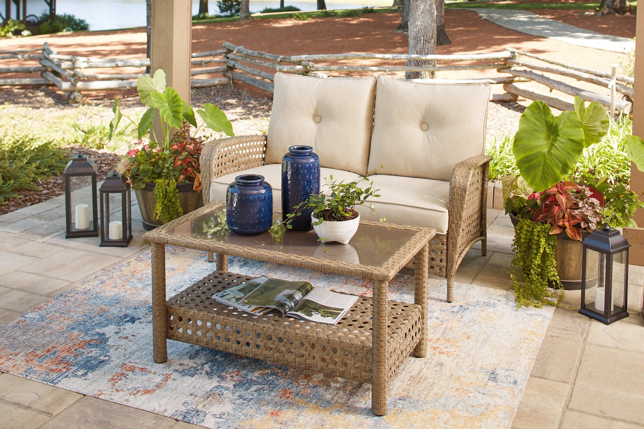 Bring a beach house look and feel to your outdoor living space with this seating package. Made of driftwood resin wicker over a powder coated steel frame, it features beautifully neutral beige cushions made of high-performance Nuvella® fabric that is colorfast and easy to clean. With this cool and casual outdoor furniture set, every day feels like a day at the beach.