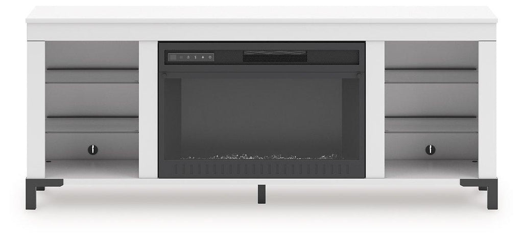 Level up your gaming experience and make movie nights to remember. This entertainment center with fireplace extends your entertainment beyond the screen. Its built-in fireplace brings the heat, synchronizing with LED backlighting on the assorted shelves. And you can customize the vibe with three trendy color options: blue, white and red. Modern function. Captivating, cool style. With this entertainment center, revamp your home’s recreational hub like never before.