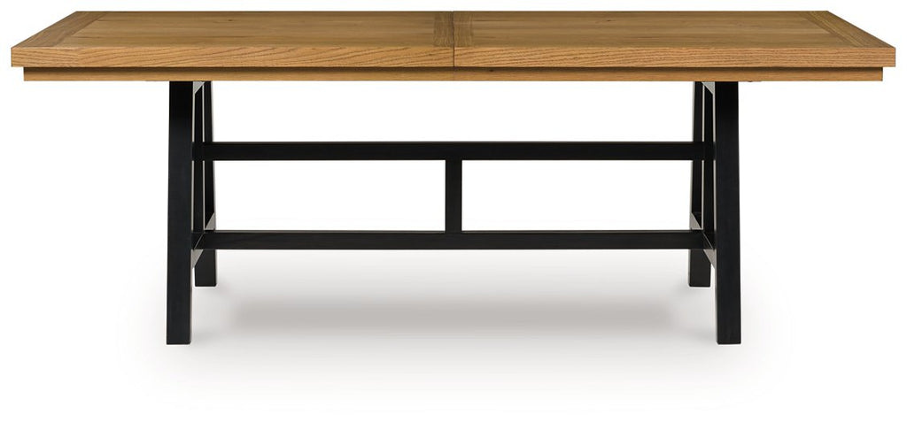 Features modern silhouette and reach in storage, covered in neutral fabric Urban Contemporary design with a rustic vibe. Made with hardwood solids, and thick rustic oak veneer. Natural wood may display natural weathering, unique cracks, splits, knots, saw marks or other organic features unique to each piece. Eclectic natural Oak and black finish scheme for a mix and match design style. Sturdy chunky legs support a thick table top with a rustic Oak finish. D841-01 spindle dining chair features a broad curved back rest with a modern take, finished in an aged black with rubbed-through edges. The cushioned seat is covered in textural woven polyester fabric. D841-02A arm chair features an inset synthetic cane back rest with a cushioned seat covered in a textural woven polyester fabric. Sideboard is finished in aged black with rubbed-through effects. Includes a reversible wine rack shelf, one adjustable shelf behind each cabinet door, synthetic cane door accents. The center drawer has fully finished drawer interior, with ball-bearing side guides and black felt bottom. D841-55 rectangular extension table features classic trestle table design in a two-tone finish. Aged black base with natural Oak top two 18” removable center leaves, can seat up to 10. D841-00 storage dining bench._x000D_