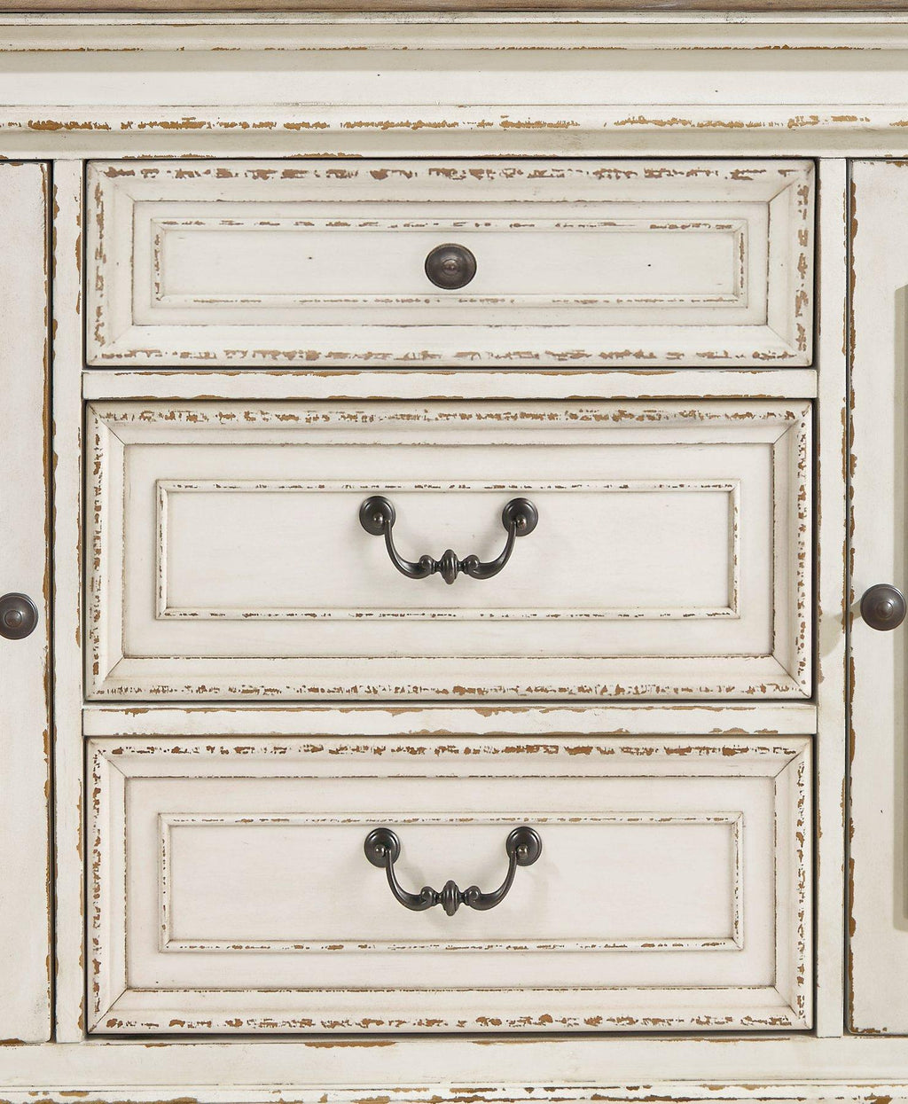 Serve up a French country-inspired feast for the eyes with this dining room server. Unique elements include cabinet storage beautified with decorative fretwork over mirrored glass and a doubly charming two-tone aesthetic pairing a chipped white with a distressed wood finished top.