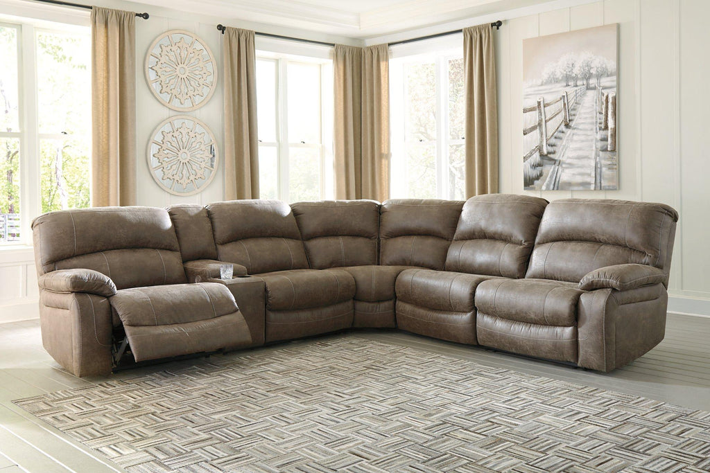 Sporting a driftwood brown faux leather with a gently distressed sense of charm, this sectional invites you to drift away in high style. Rest assured, the sectional’s leather alternative upholstery offers a warm, cozy feel, while clean-lined styling and jumbo stitching deliver the cool, contemporary look you love. Factor in power reclining motion, USB charging, convenient cup holders and a drop-down table, and you’ve got all the makings for the best seats in the house.