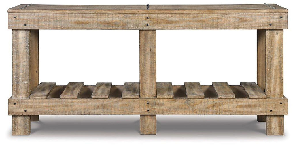 As this console table proves, sometimes less is more. Dramatically transform your living space with the warm and rustic appeal of solid wood construction and open-slat shelving. Washed in a light brown finish, this sofa table sets a new standard for down-to-earth refinement.